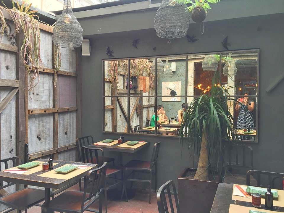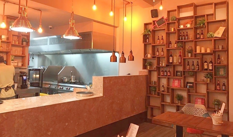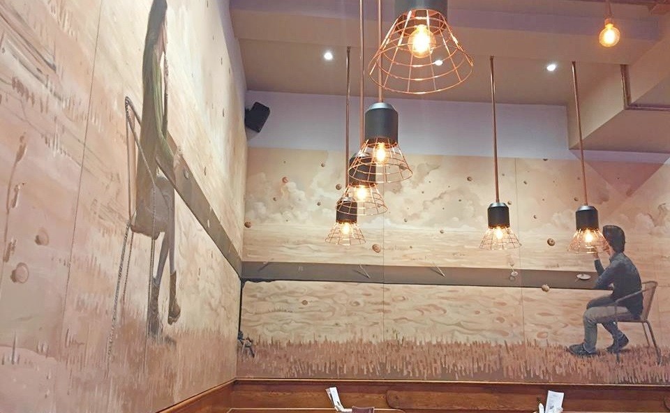 O espaço é jovem e descontraído e foi decorado com gosto. O que mais me chamou a atenção foi a cozinha aberta, a estante com cervejas artesanais e, claro, um painel de Regg Salgado, um artista urbano português que reinterpreta aqui a pintura ‘Praia das Maçãs’ de José Malhoa que retratava a taberna do Sr. Manuel Dias Prego e que os proprietários quiseram aqui homenagear.