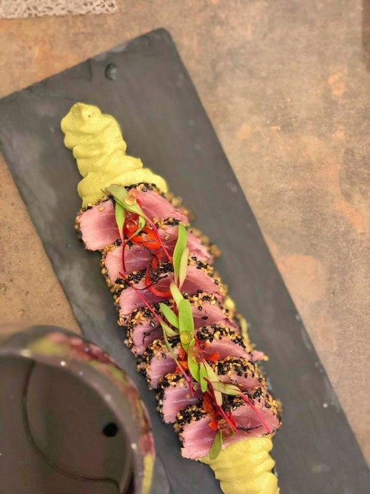 De seguida, foi nos apresentado um dos meus pratos preferidos da refeição: O Tataki na Província de Kochi. Ou seja, um atum otimamente braseado, com sementes de sésamo e uma espécie de puré abacate muito boa.