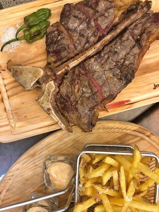 Para prato principal escolhemos o T-Bone (Aroquesa DOP) com maturação de 20 dias, acompanhado de batata-frita. A carne estava suculenta e no ponto e as batatas eram caseiras (apetece-me bradar aos céus quando isto acontece… é tão raro e tão bom).