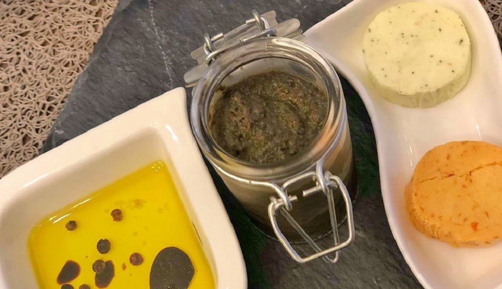 Primeiro fomos recebidos com um couvert delicioso composto por Pão&Tostas (de Mafra e de abóbora e noz), uma pasta de azeitonas e alcaparras (Tapenade Enfrascada) muito boa mesmo, uma manteiga de ervas e outra de tomate seco e ainda um azeite aromatizado.