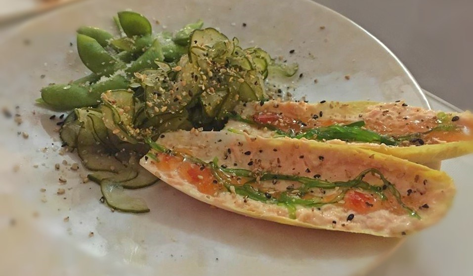 Começámos o jantar com o couvert do restaurante. Uma folha de endívia com pasta de salmão, molho sweet chilli, goma wakame e sésamo, acompanhada com Sunomono de pepino e edamame (soja verde em vagem), uma mistura de sabores bastante interessante.